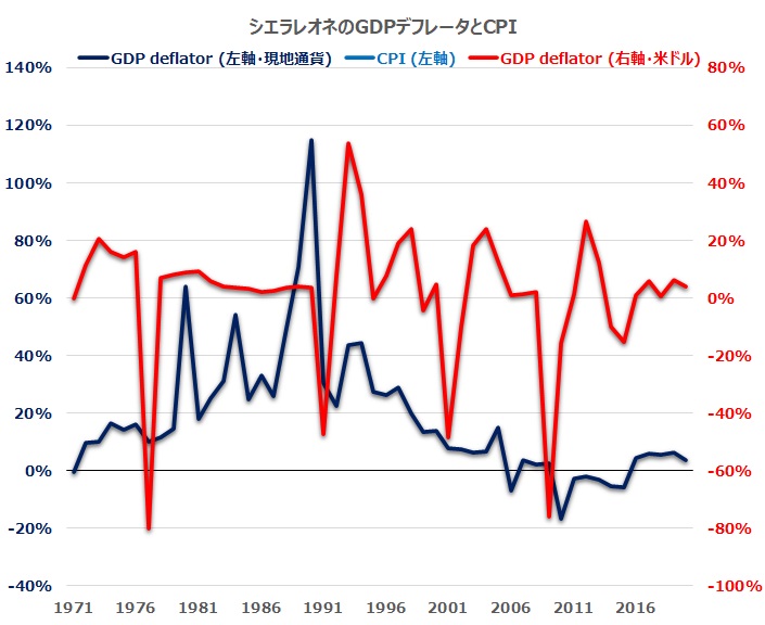 以下は1970-2020年までのとGDPデフレータ(現地通貨建てとドル建て)の成長率の推移です。ただし、GDPデフレータに関しては1990年以前はデータが利用できません。