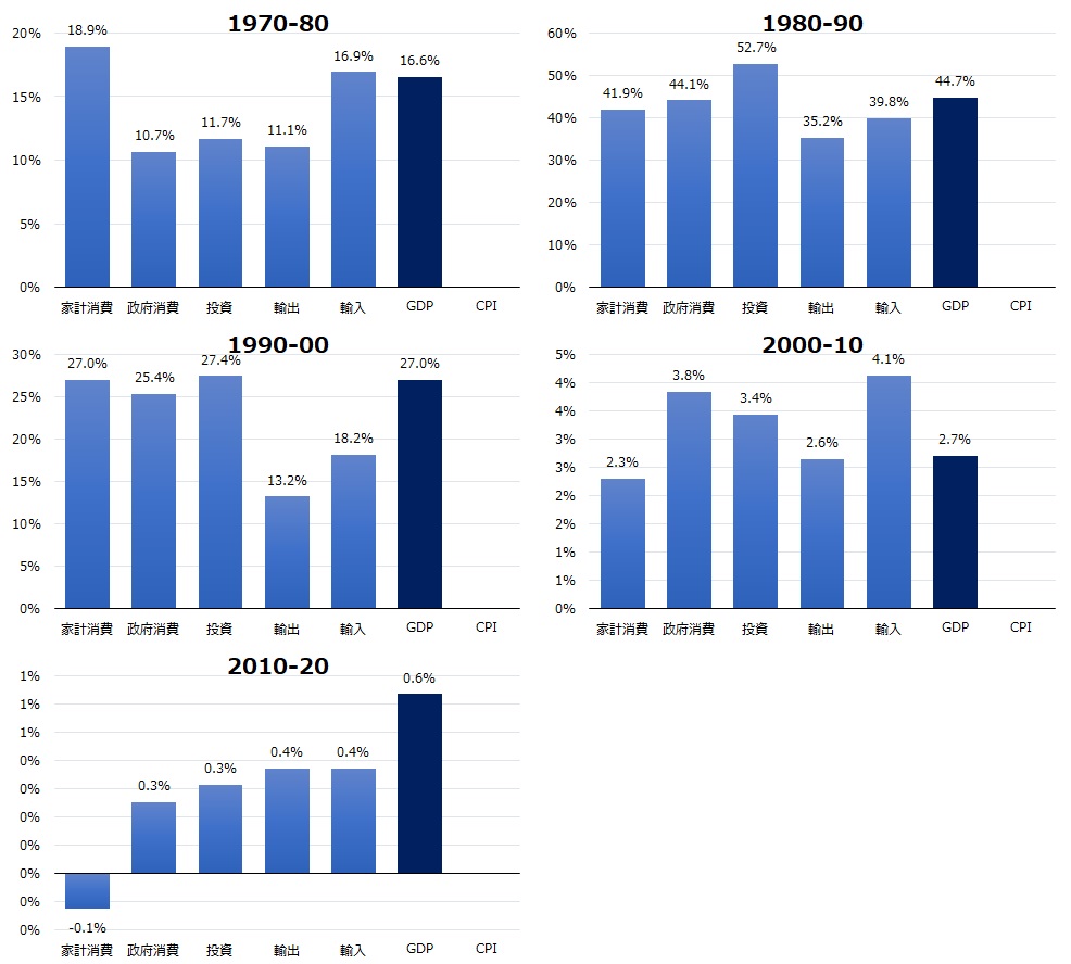 1970年代は、すべての消費項目が2桁変化率となっており、その結果GDPデフレータの変化率も16.6%と高いインフレとなっています。