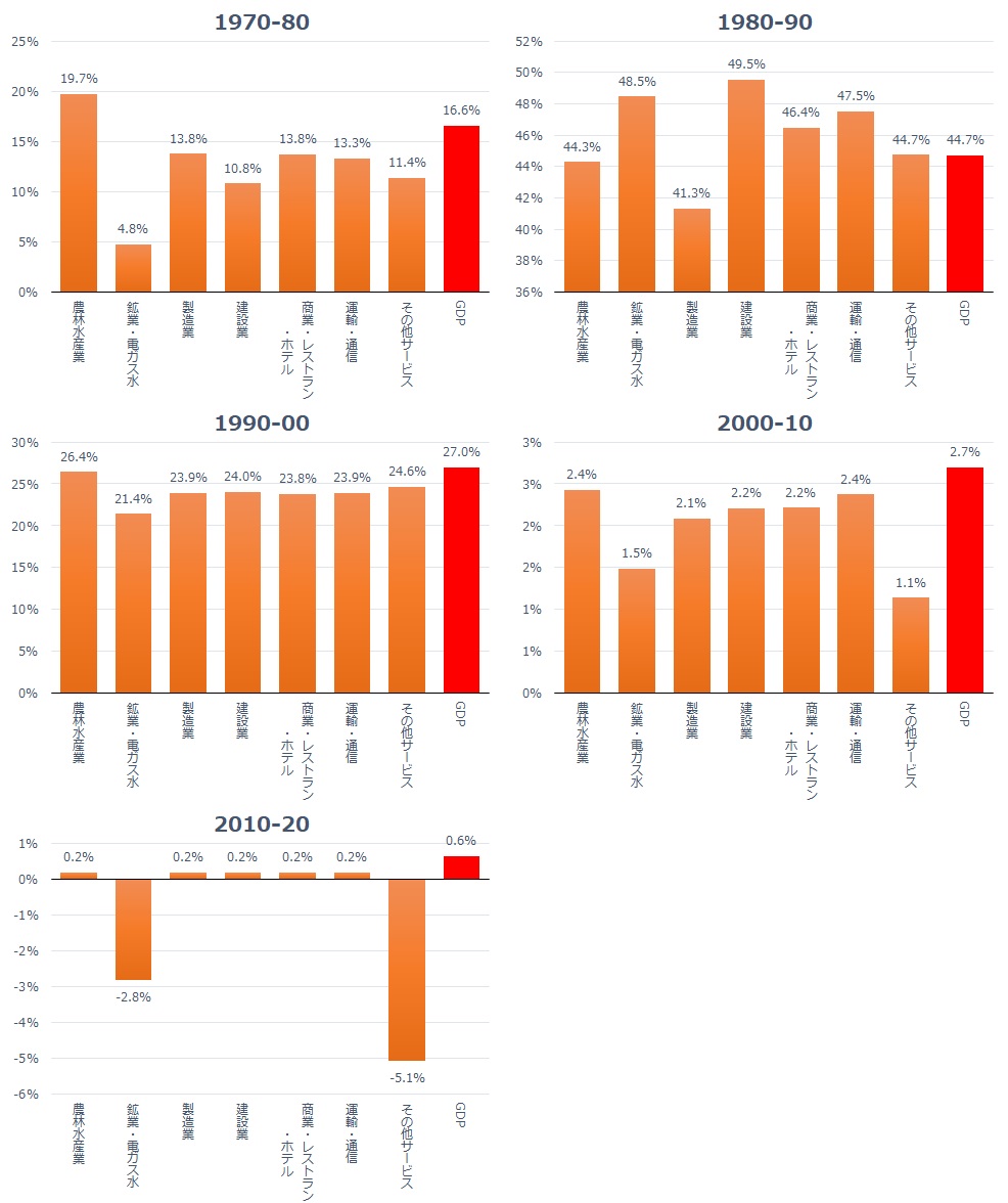 しかし、2000年代ではすべての産業のデフレータ変化率は3%以下まで減速し、さらに2010年代には鉱業やその他サービスはマイナスとデフレになるほどまで減速しています。その結果、GDPデフレータはそれぞれ2.7%と0.6%まで低下しています。