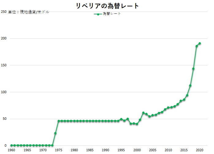 為替レートに関しては、1960年では1ドル=1.0リベリア・ドルでしたが、1975年には1ドル=1.0リベリア・ドルへ上昇し、その後1996年までは固定レート、1997年には変動相場となり、2020年には1ドル=191リベリア・ドル程度まで通貨安となっています。