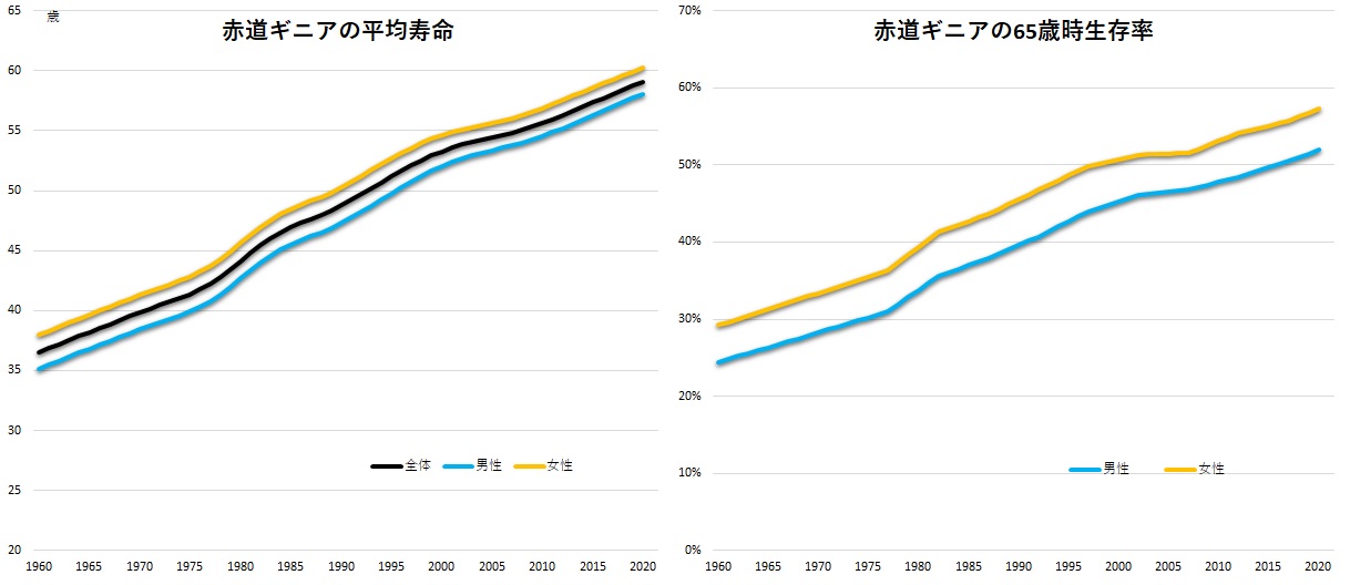 以下は赤道ギニアにおける平均寿命の推移と65歳時点での生存率を表しています。