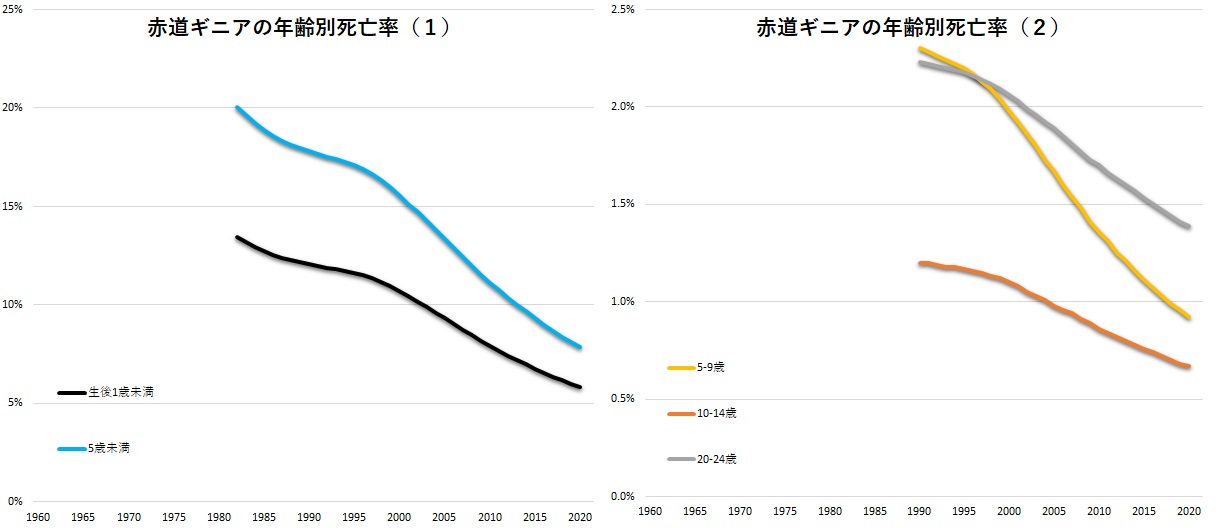 また、子供(5-9歳)、青少年(10-14歳)、若年(20-24歳)の死亡率は1990年以降3%以下で推移しており、また近年にかけて緩やかな減少傾向にあります。