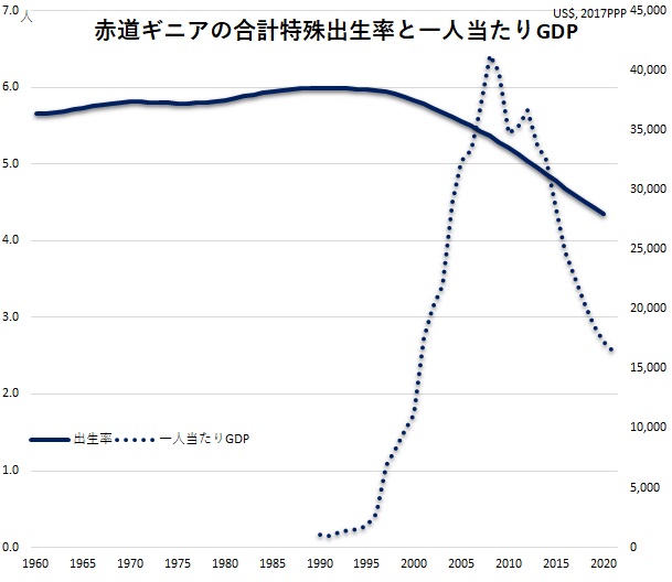 赤道ギニアでは1960年では合計特殊出生率は6人近くあり、1990年には6人に達しますが、その後は減少傾向へ転じ、直近では4.5人程度まで改善しています。