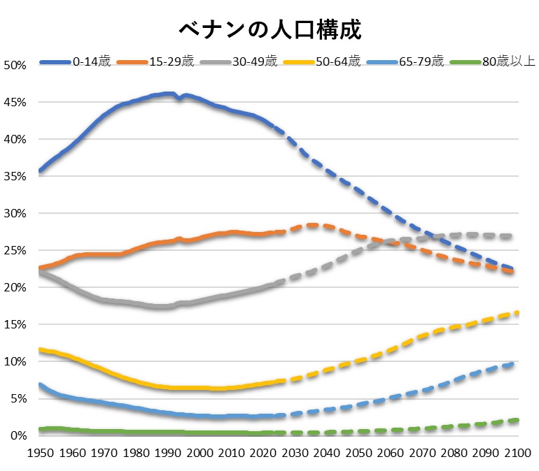 このグラフは、ベナンの人口構成の変遷を示しており、1950年から2100年までの間に年齢層ごとの割合がどのように変化していくかを明確に示しています。1950年時点では、15歳未満の若年層(青の部分)が人口の約45%を占めており、出生率の高さを反映しています。しかし、時間の経過とともにその割合は徐々に減少し、2100年には20%ほどになると予測されています。