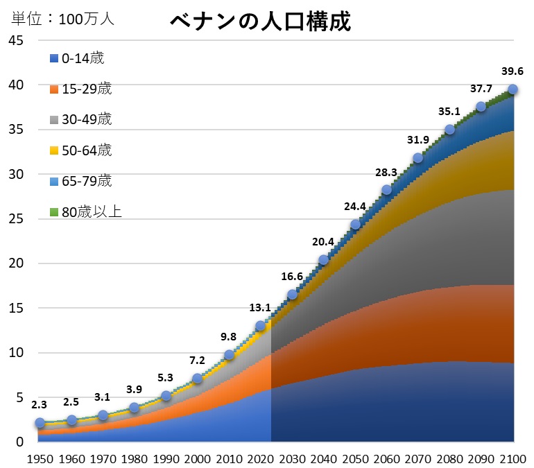 ベナンの社会構造においては、15〜29歳の働き盛りの若年層(オレンジの部分)が引き続き経済活動の中心を担い、国内外での経済発展に寄与することが期待されます。一方で、50歳以上の中高年層(黄色、青、緑の部分)が増加していくため、高齢化社会に向けた医療サービスの整備や年金制度の確立が今後の課題として浮上するでしょう。