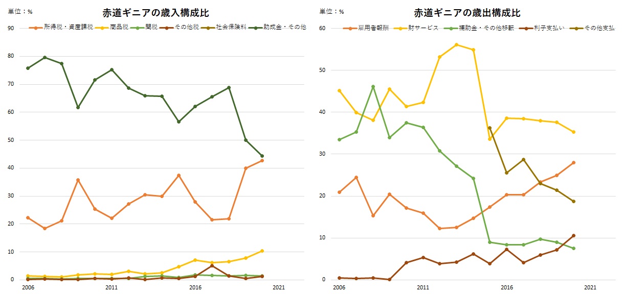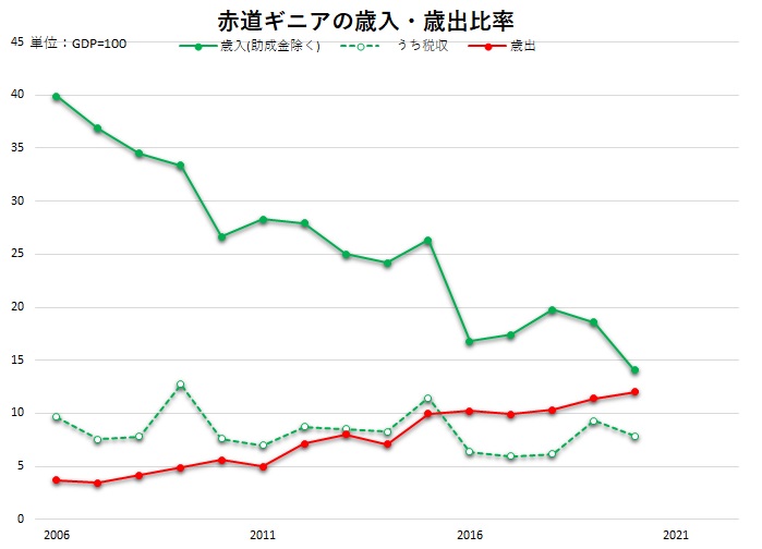 赤道ギニアの歳入は206年ではGDP比で40%ほどありましたが、直近では14%以下まで半減しています。