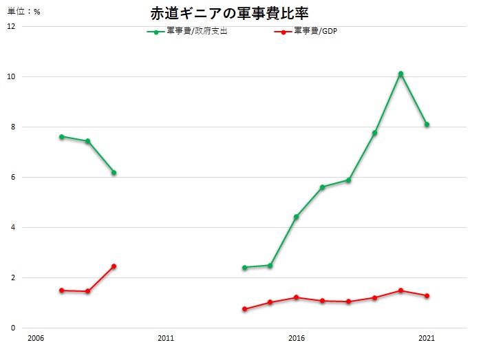 赤道ギニアのGDPに対する軍事費は1.3%でアフリカ諸国の中では29位、また、対政府支出比では8.1%でアフリカ諸国の中では16位と、中位に位置しています。