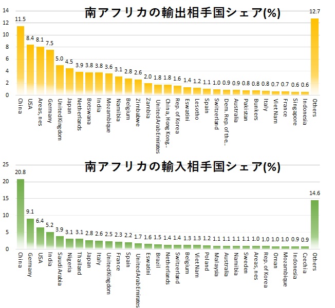 南アフリカの最大の輸出相手国は中国で輸出全体の11.5%に相当します。