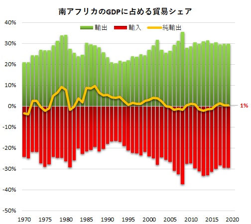 南アフリカでは、輸出額と輸入額はほぼGDPの20-30%で推移しています。