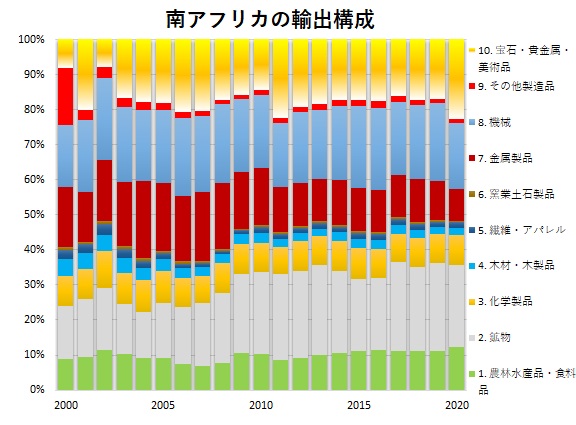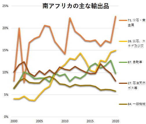 以下は2000年以降の南アフリカの輸出品の構成です。