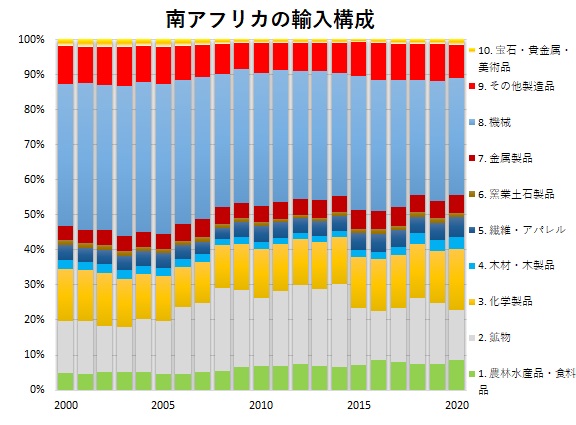 2020年の南アフリカの輸出は2.鉱物が24%、10.宝石・貴金属・美術品が23%、8.機械が19%、1.農林水産品・食料品が12%と輸出品は比較的多岐にわたっています。