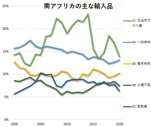 南アフリカは世界でも有数のプラチナや金の産出国ですので、特徴的な輸出構成と言えます。