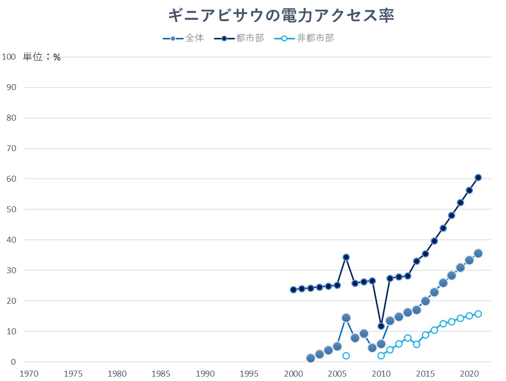 2000年代前半での電力アクセス率は一国全体では5%ほど、都市部では25%、非都市部ではほぼ0%でしたが、その後は上昇し、直近では都市部は60%ほど、非都市部は15%となっています。